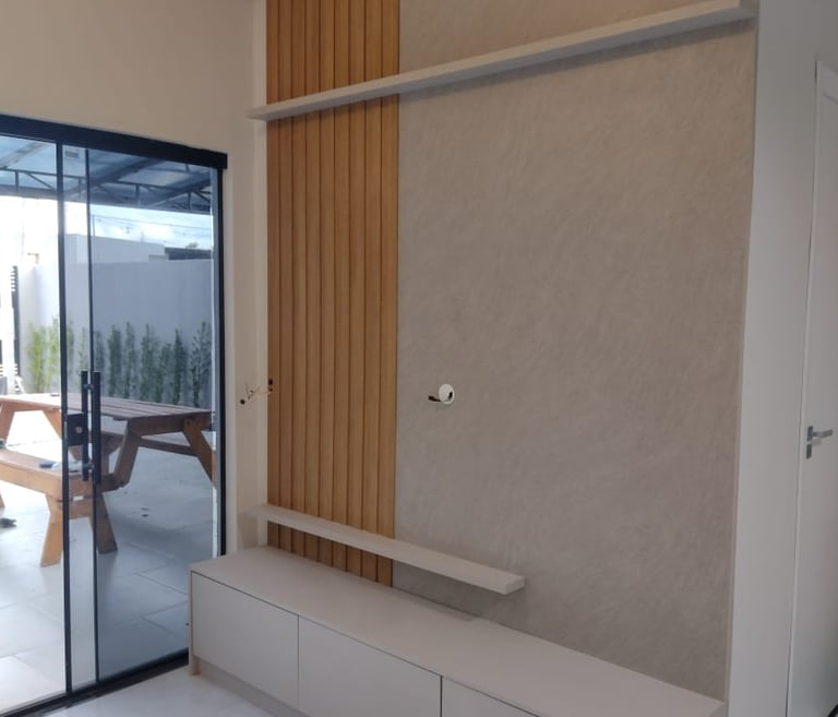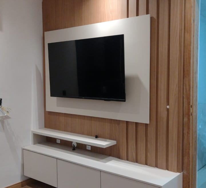 Sala de estar com painel de TV e rack.